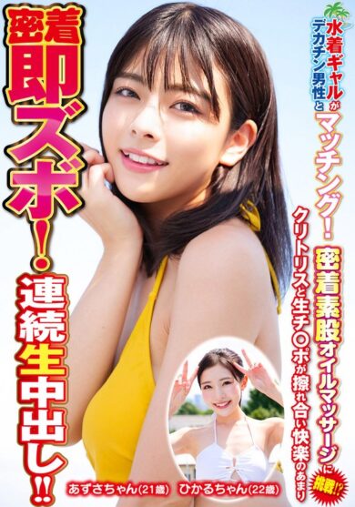 水着ギャルがデカチン男性とマッチング!密着素股オイルマッサージに挑戦!?クリトリスと生チ○ポが擦れ合い快楽のあまり密着即ズボ!連続中出し!!ひかるちゃんあずさちゃん